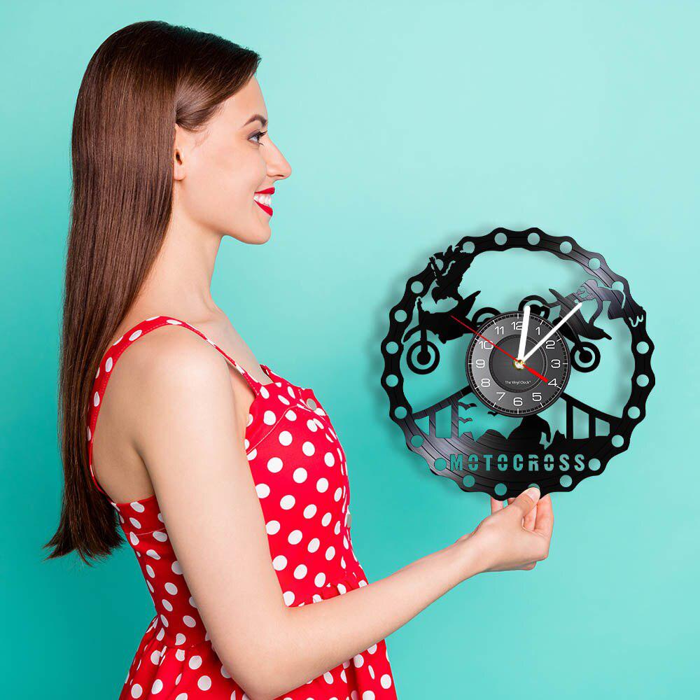 This motocross clock is made from recycled vinyl records and is silent and comes with a LED light making it an excellent gift or piece for the home, garage, or workplace.